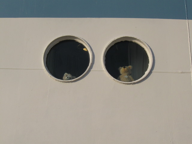 Charly and Tapsy looking out our stateroom portholes